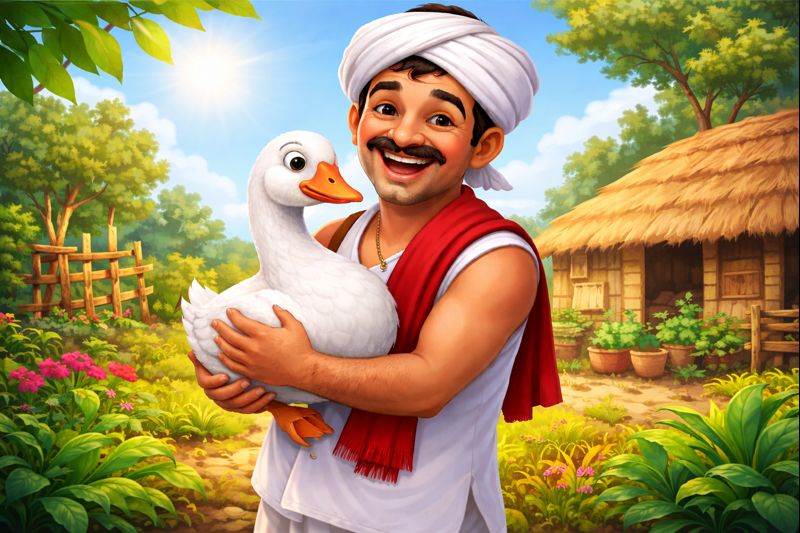 அதிசய வாத்துடன் மகிழ்ச்சியாகப் பொழுதைக் கழிக்கும் விவசாயி.