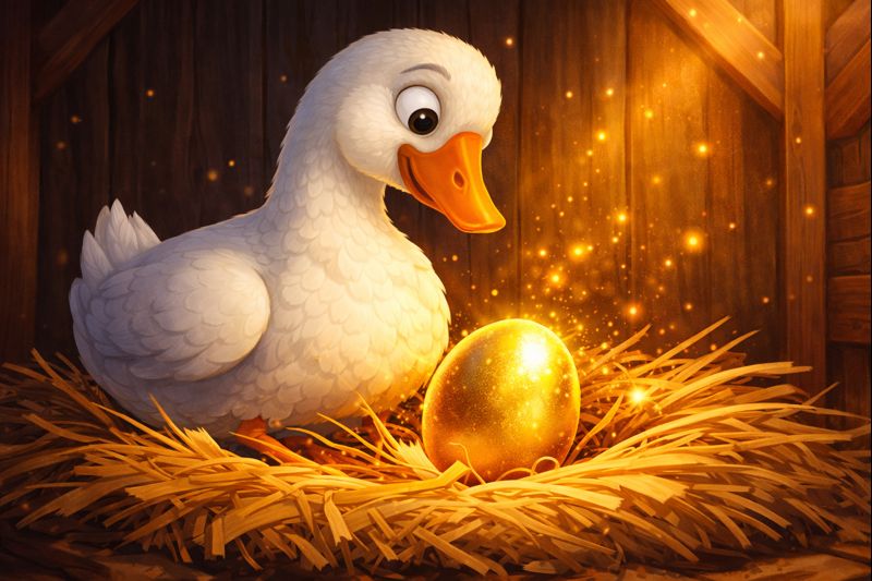 வைக்கோல் மெத்தை விரித்த மரத் தொழுவத்தில், அந்த அதிசய வாத்து ஒரு ஜொலிக்கும் தங்க முட்டையை இடுகிறது. அந்தத் தங்கத்தின் ஒளி அறையெங்கும் பரவி மாயாஜாலச் சூழலை உருவாக்குகிறது.