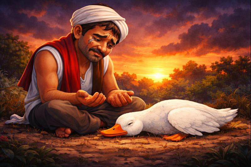 அந்தி சாயும் வேளையில், தனது தவறான முடிவினால் அன்பிற்குரிய வாத்தை இழந்து, கைகள் காலியாக இருக்க, செய்வதறியாது தலைகுனிந்து அமர்ந்திருக்கும் விவசாயி.